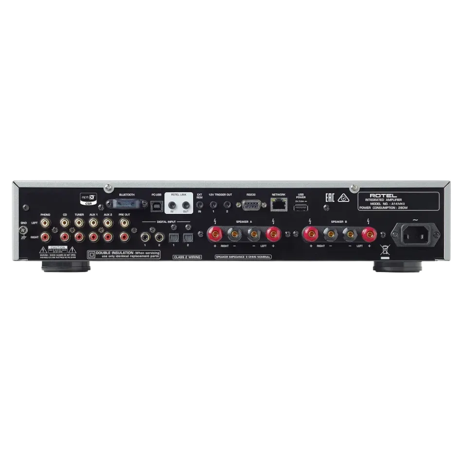 A14MKII erbjuder en mängd anslutningsmöjligheter för att tillgodose olika ljudkällor. Den har fem analoga RCA-ingångar, inklusive en dedikerad phono-ingång för skivspelare med Moving Magnet-pickup, vilket gör det enkelt att njuta av din vinylsamling med överlägsen ljudkvalitet. För digitala källor finns två optiska och två koaxiala ingångar som stöder upp till 24-bitars/192kHz upplösning, samt en PC-USB-ingång som hanterar upp till 32-bitars/384kHz, vilket ger flexibilitet för olika digitala enheter.