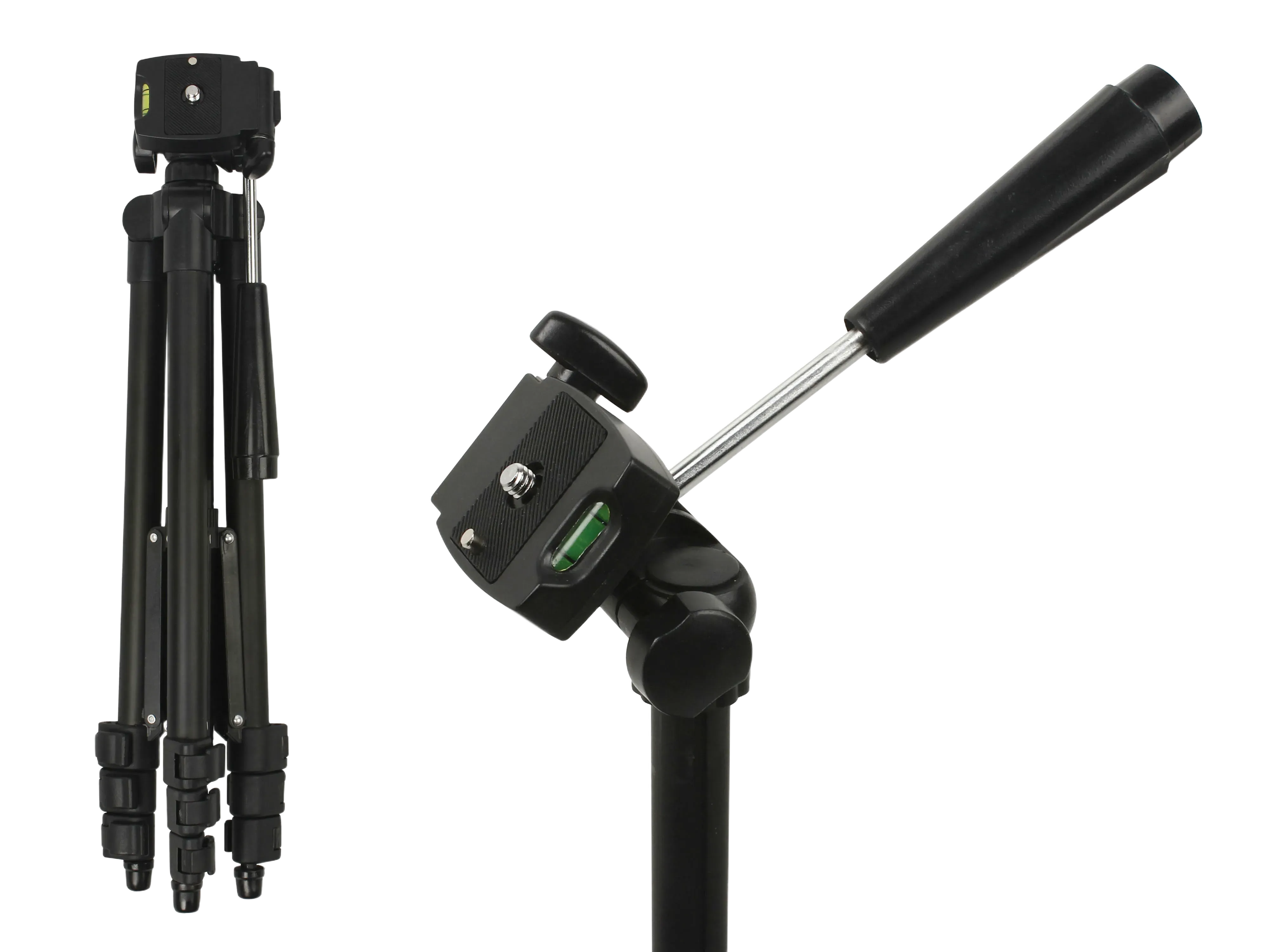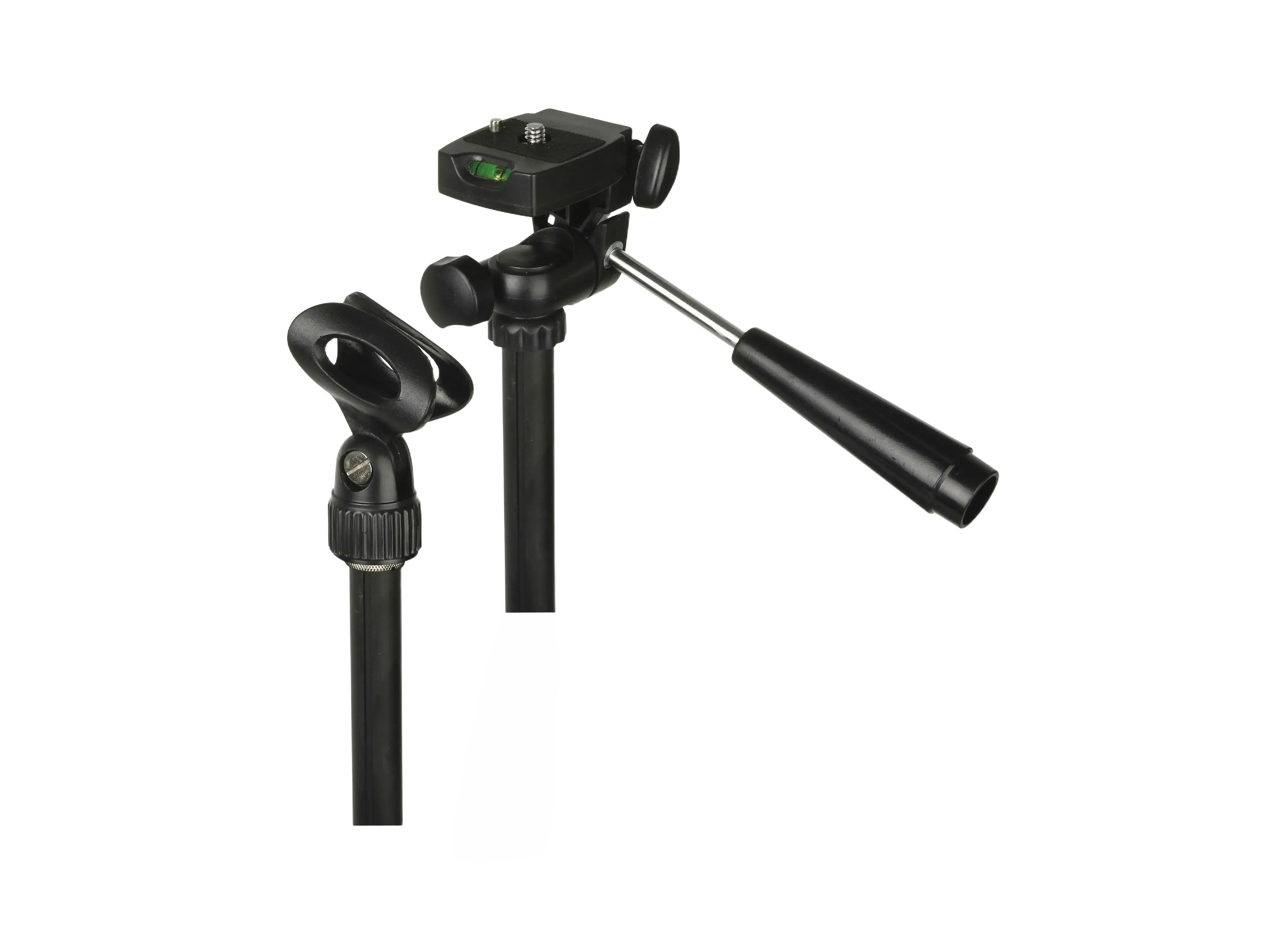 Ett stabilt och bra stativ för mikrofon eller kamera. Har ett trevägshuvud, lätt att justera i höjd och vinkel och att fälla ihop och ta med sig i detmedföljande resefodralet.